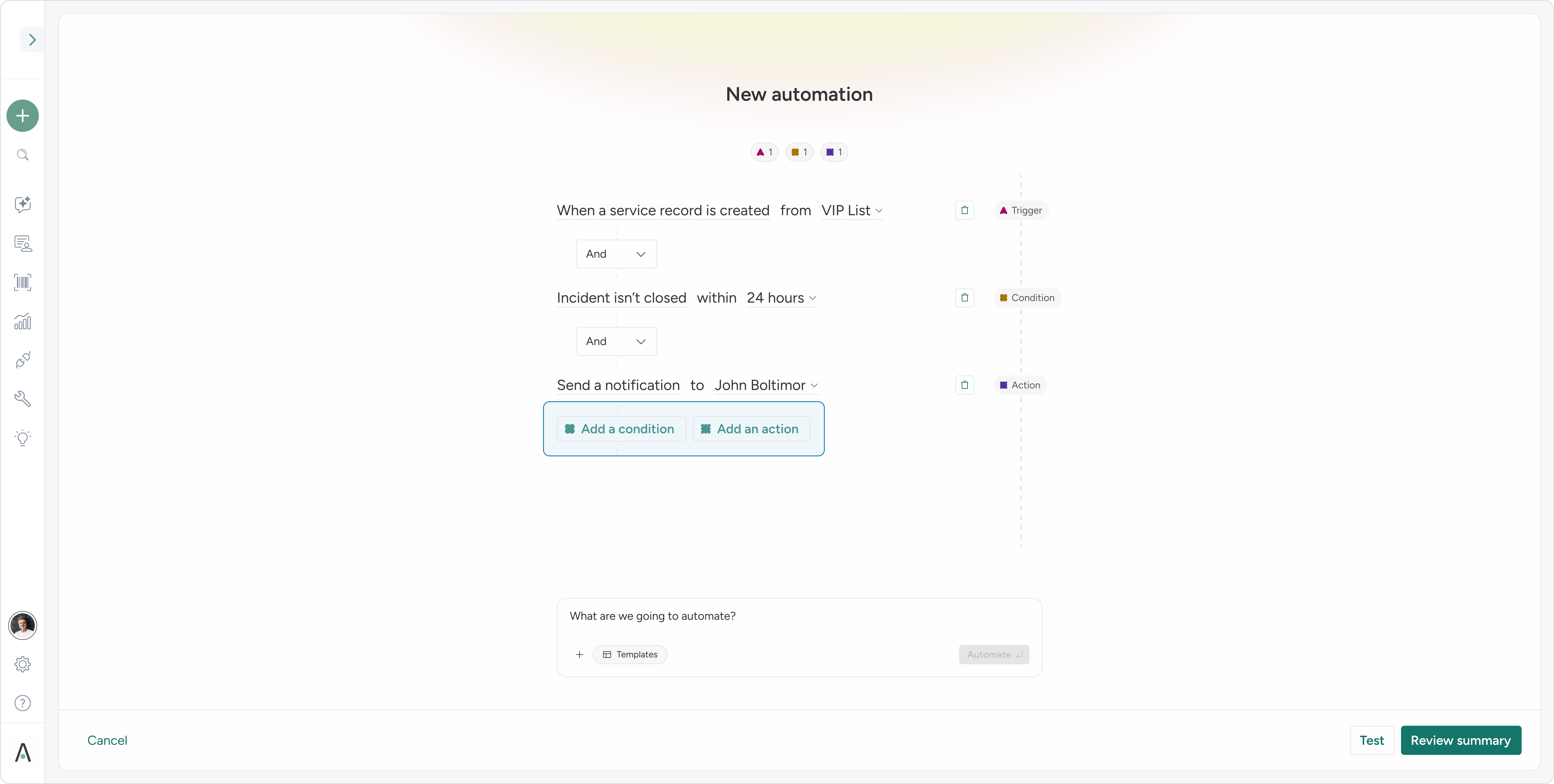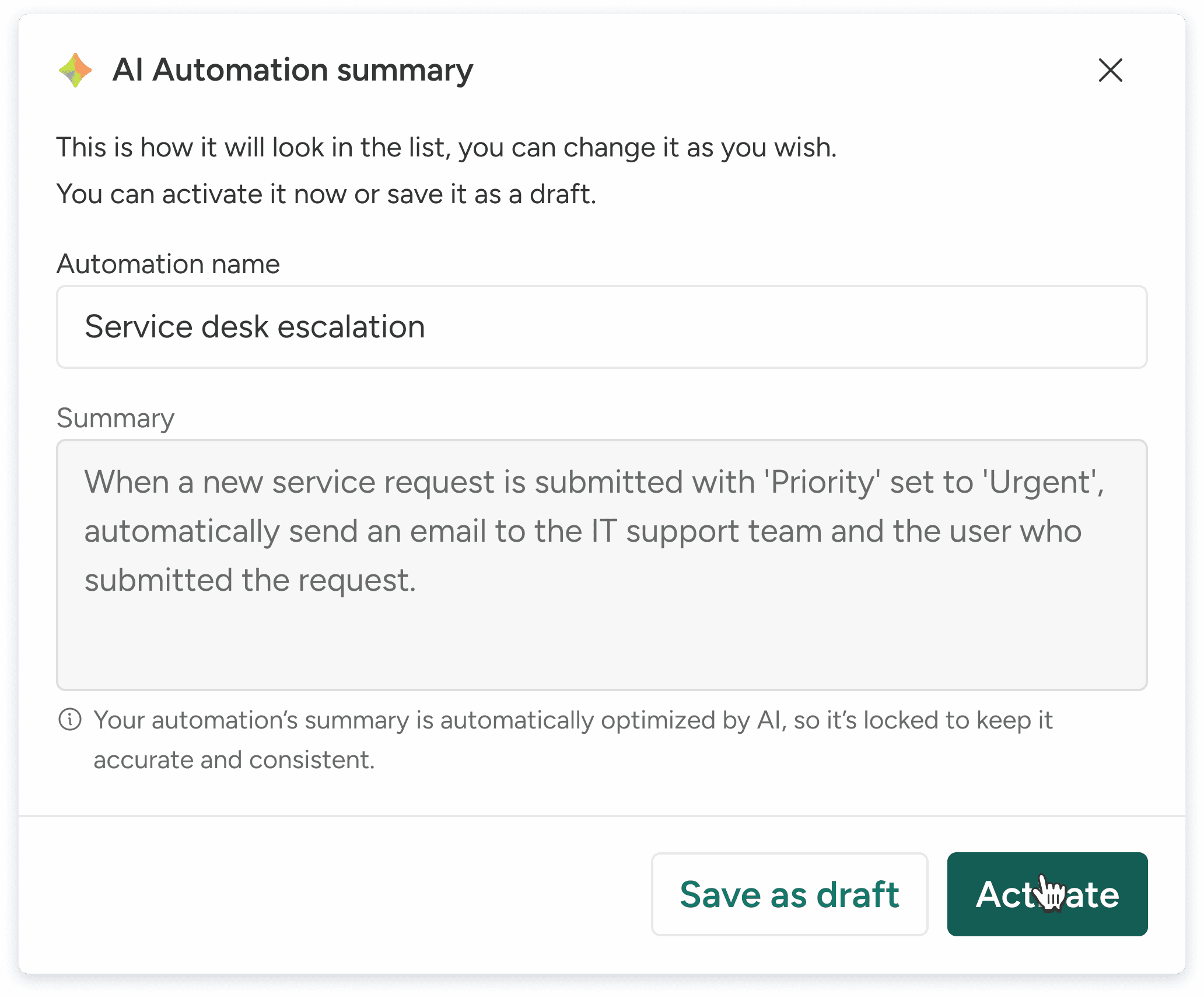 AI summarizes complex automations and suggests names - so users finish faster and save confidently.