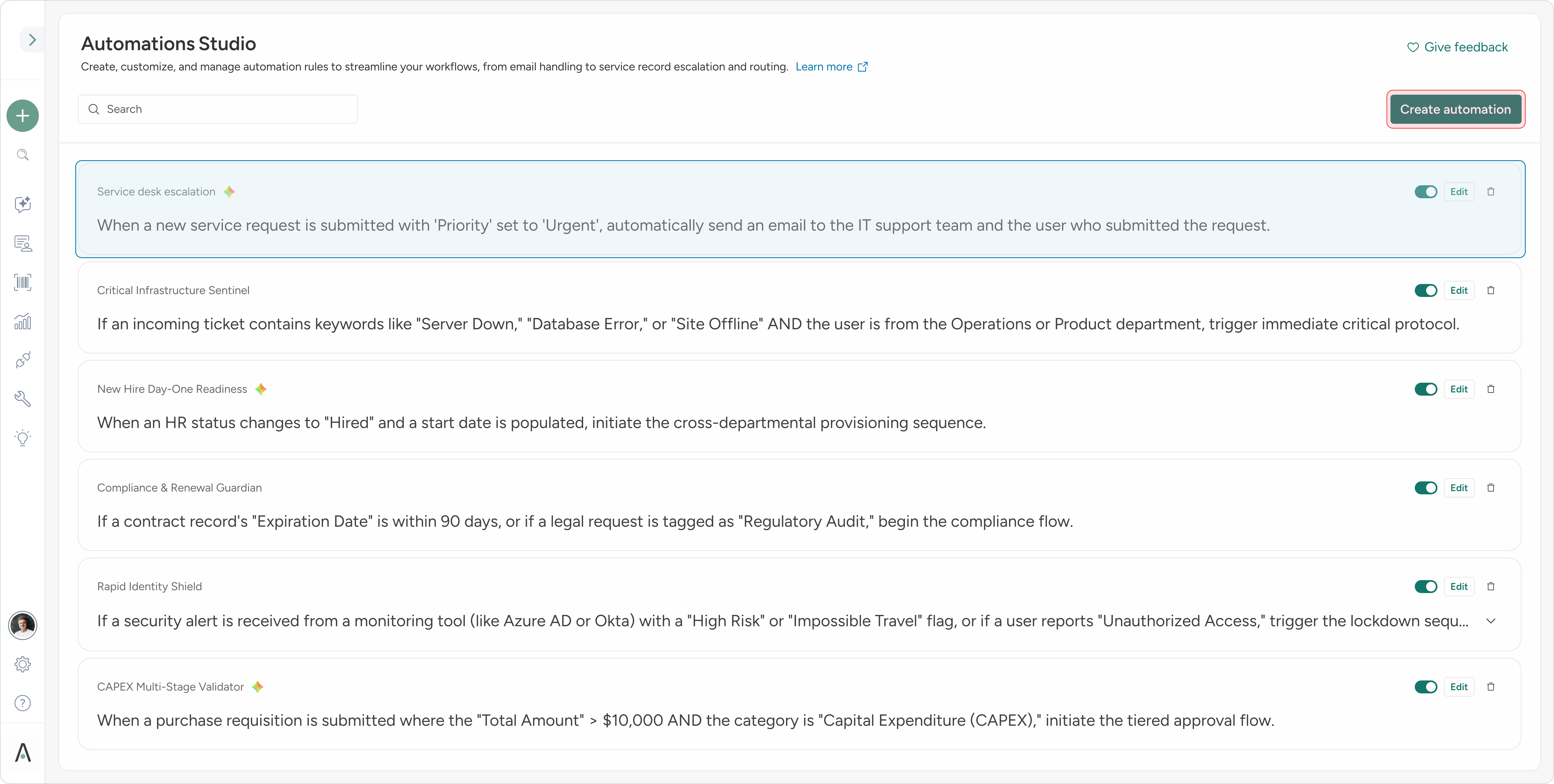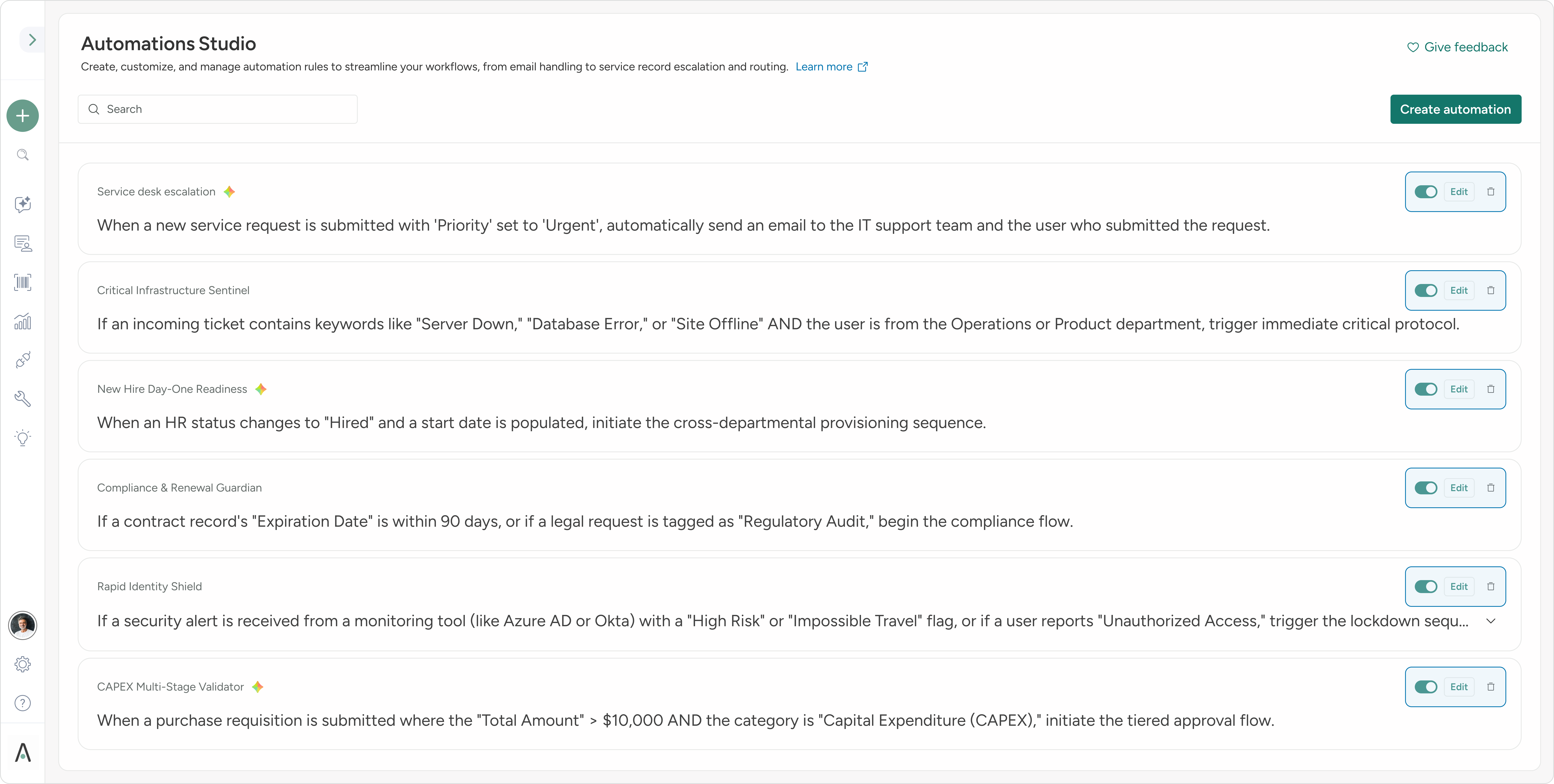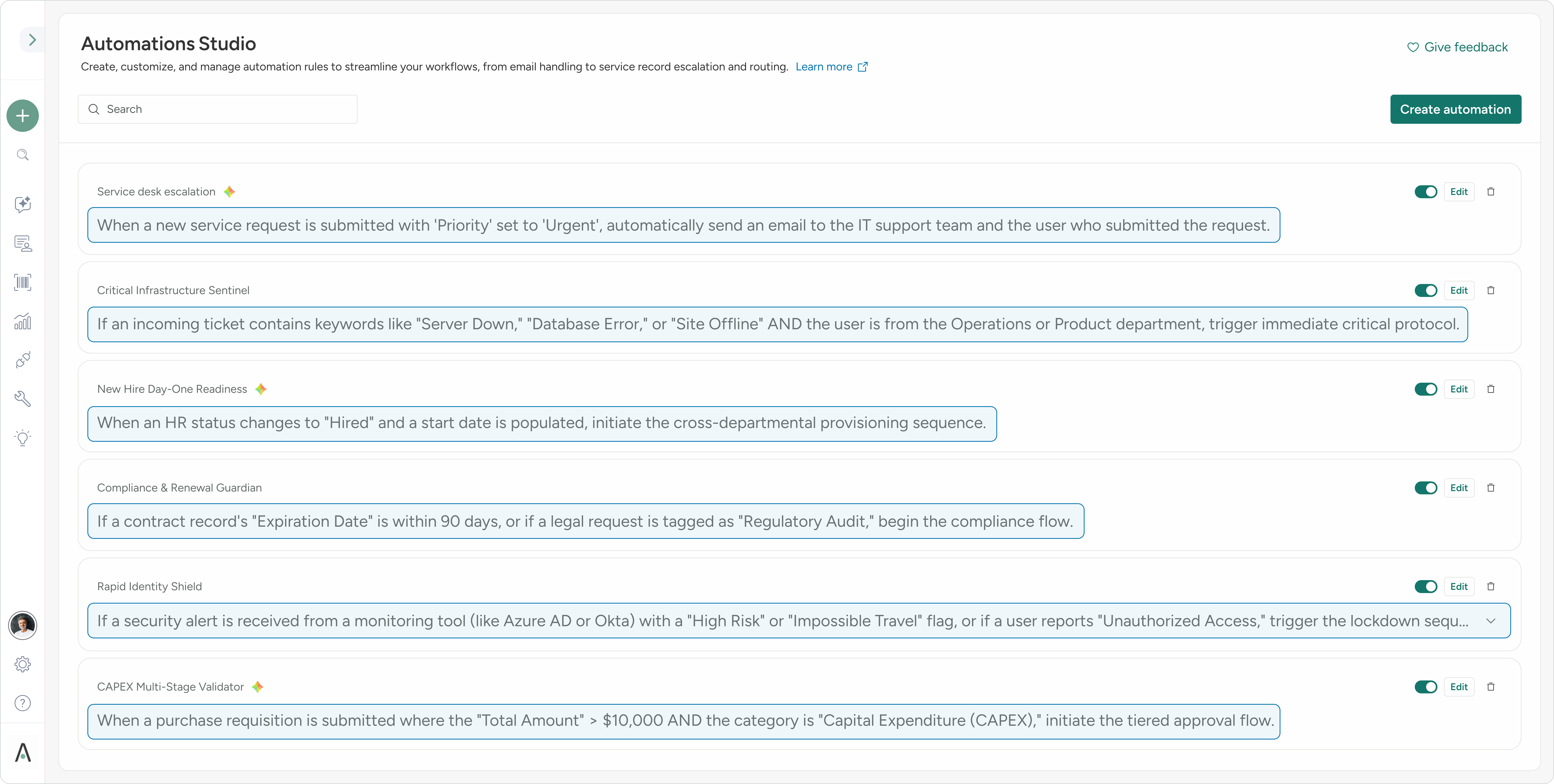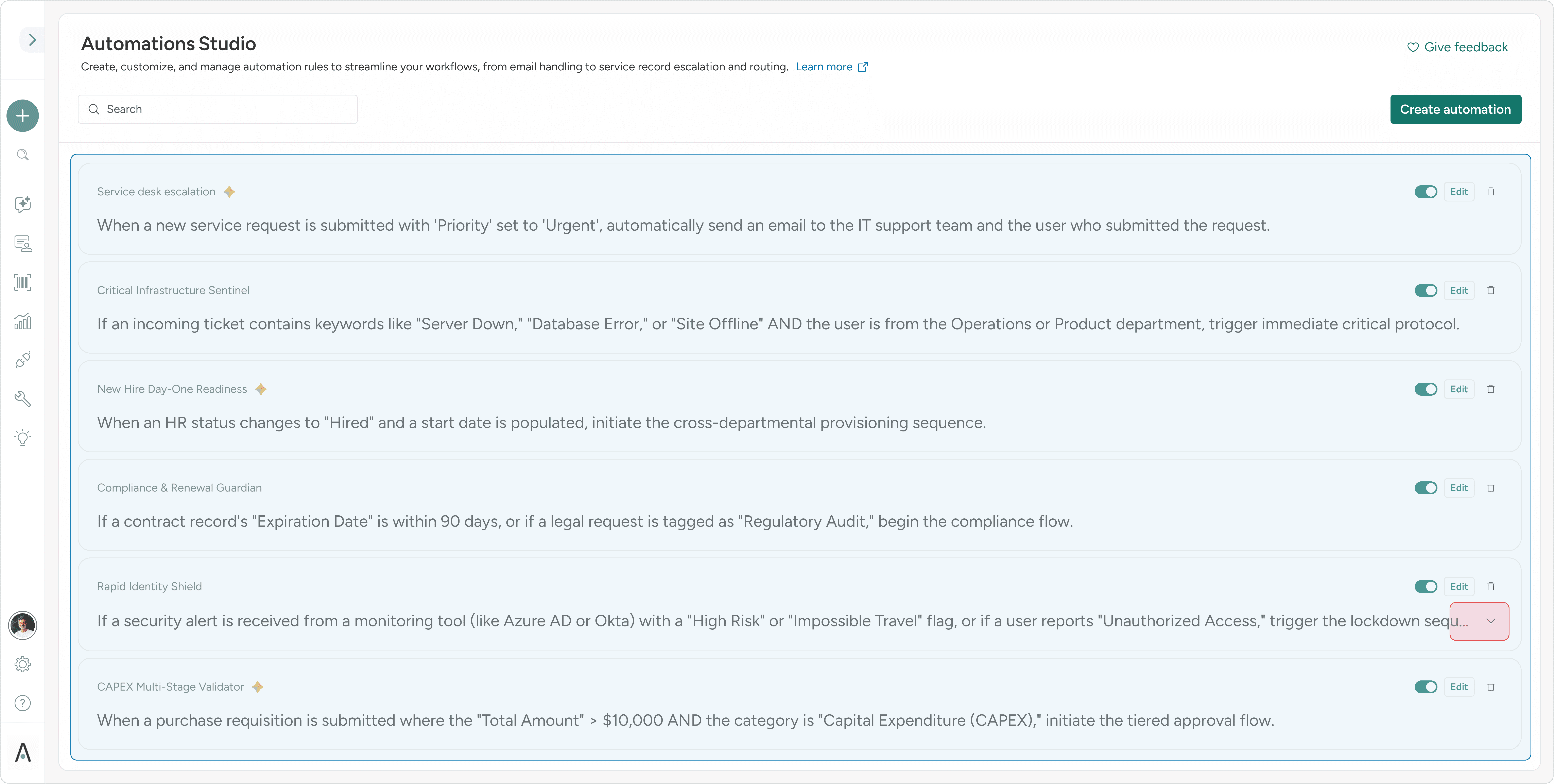 Easy toggles and editing tools make managing automations intuitive and efficient for all users.