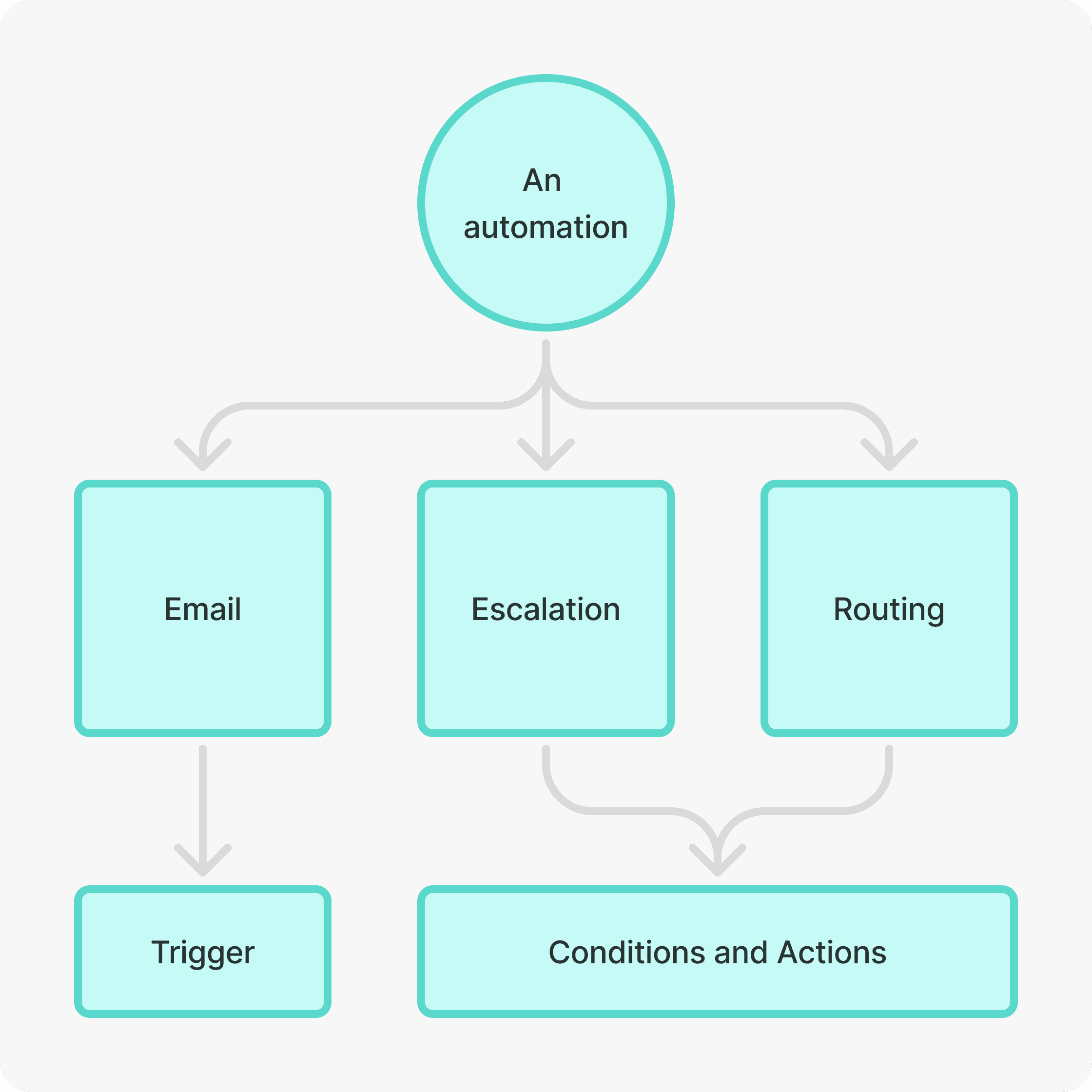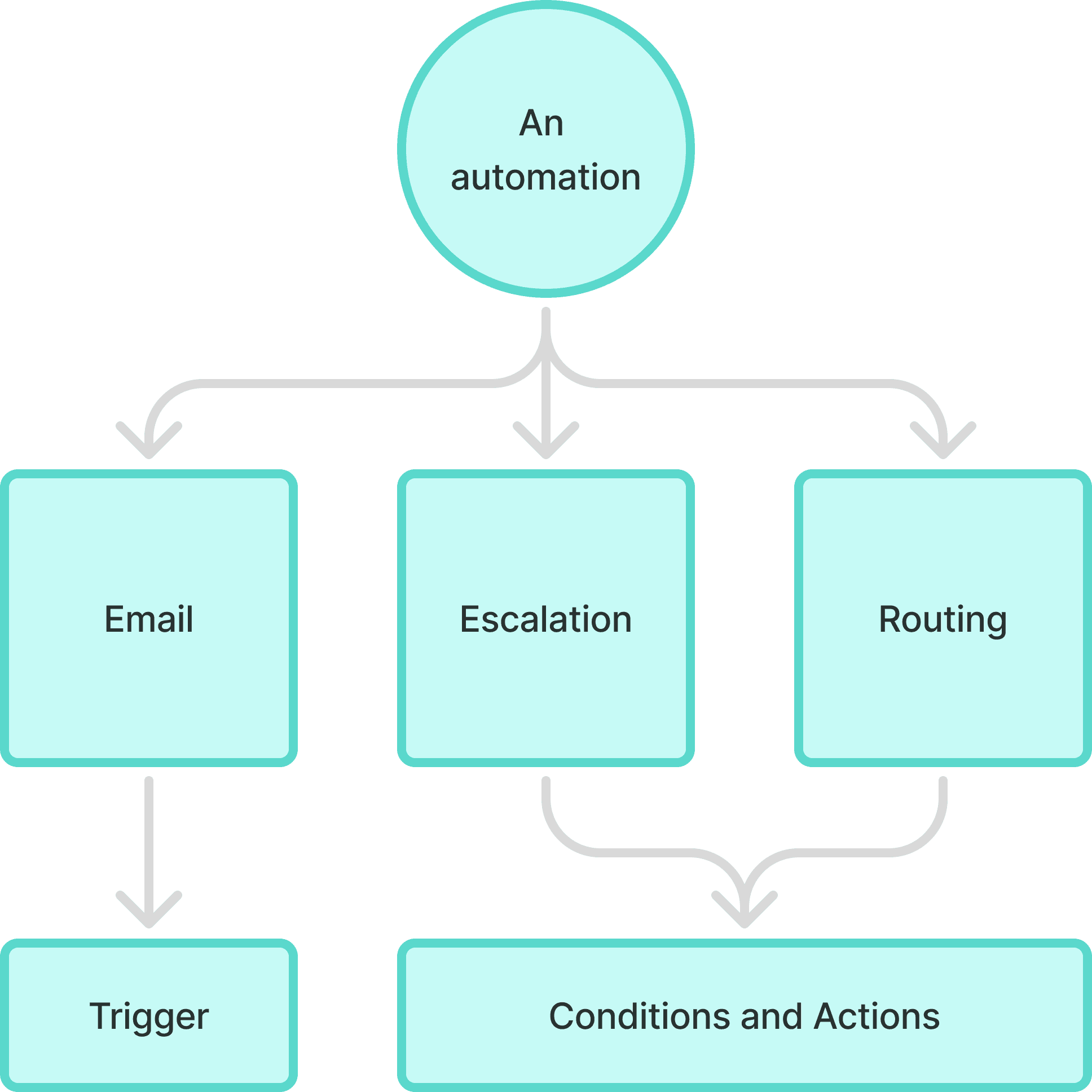 One automation is built from three different rules: Email, escalation, and routing.