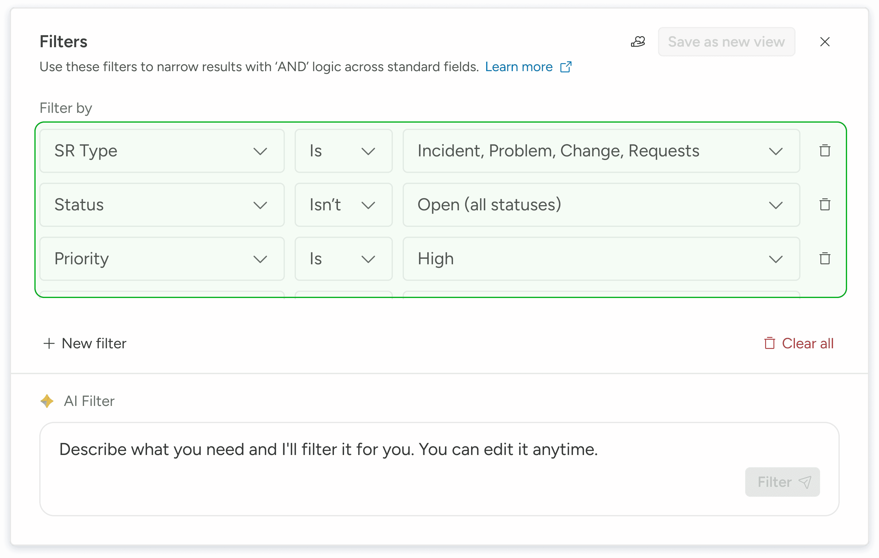We intentionally placed manual filtering in a higher visual hierarchy. This preserved user confidence while allowing AI results to populate immediately above, reinforcing clarity and predictability.
