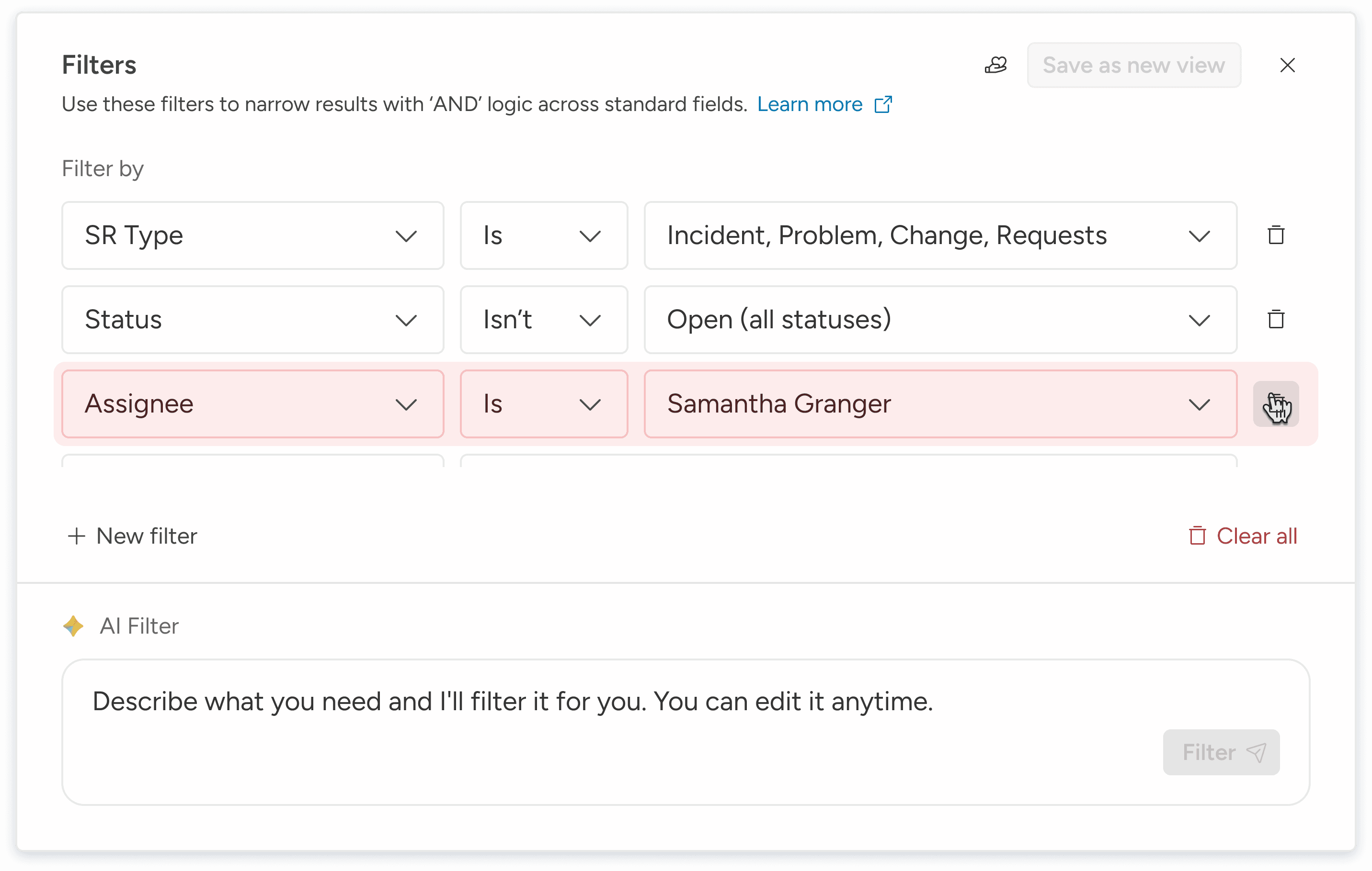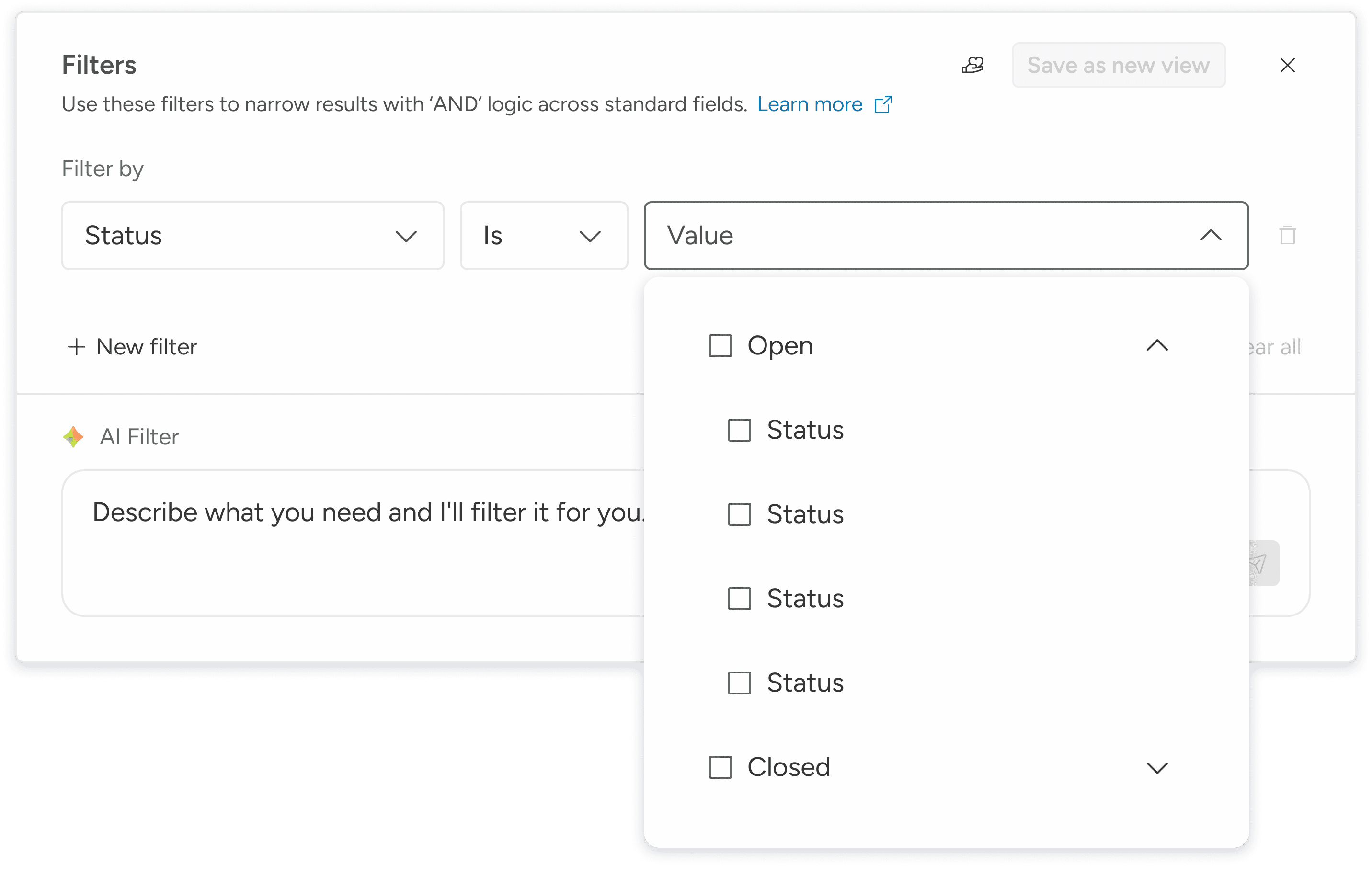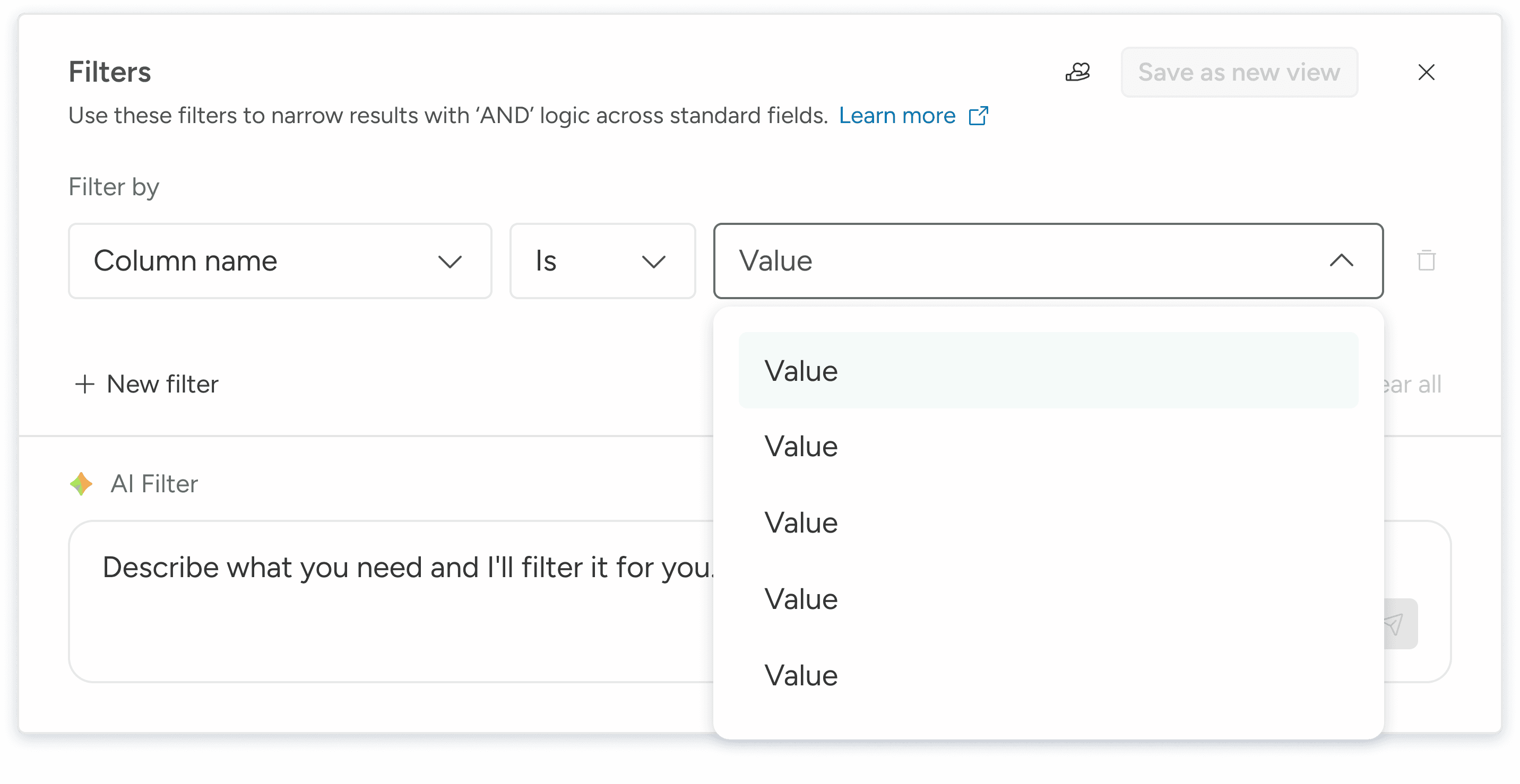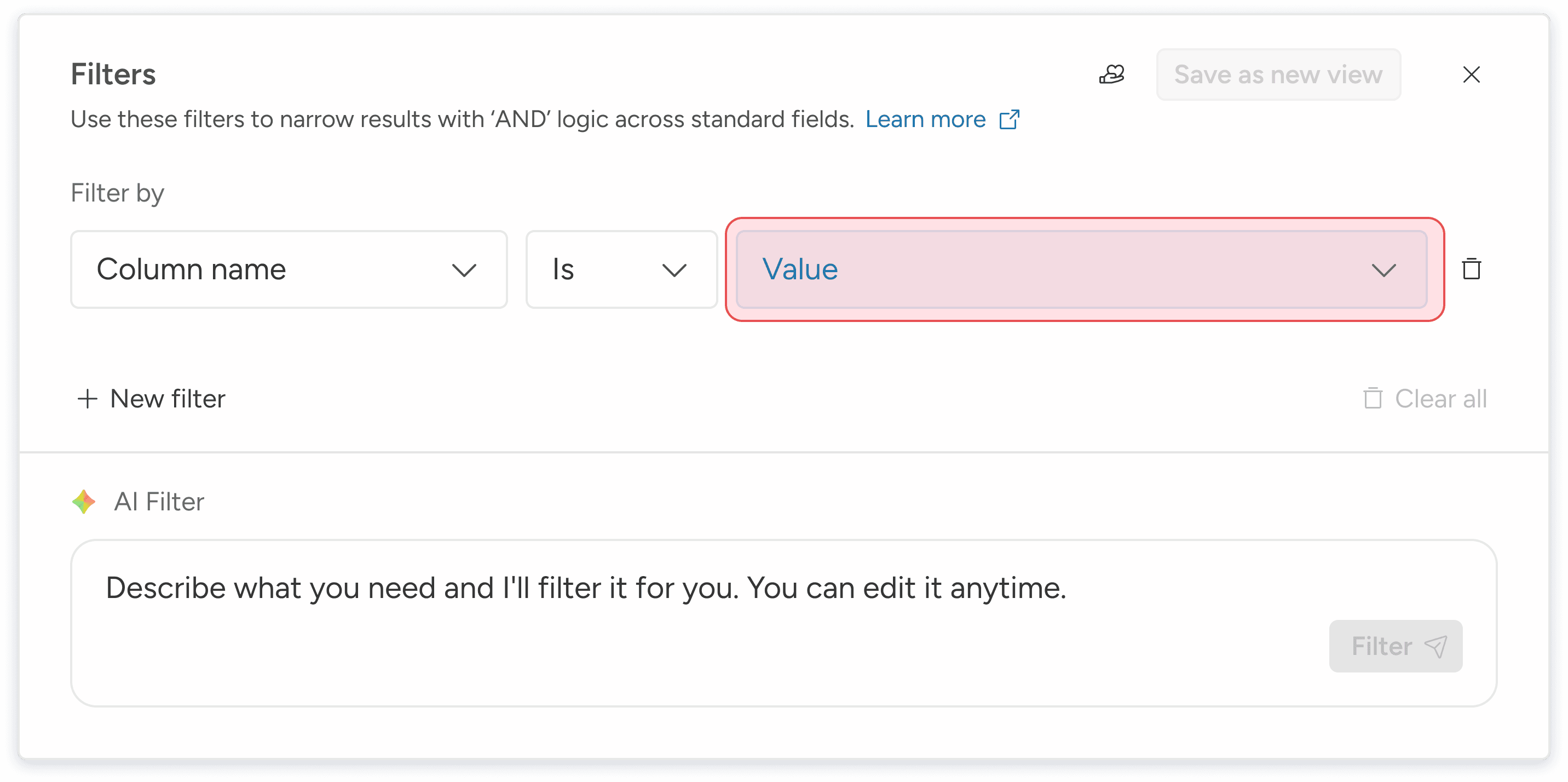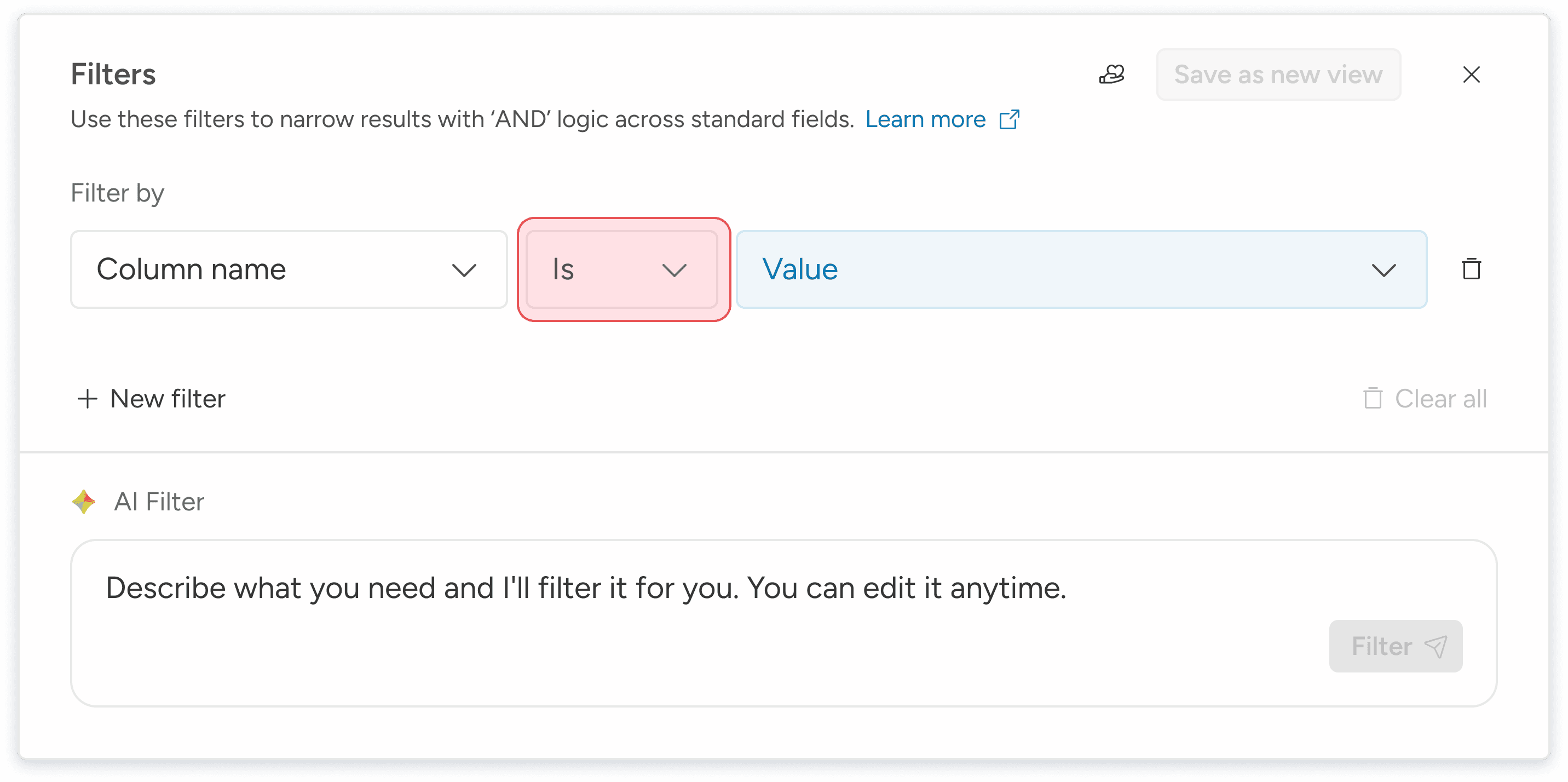 Time-to-Filter: The average time spent in the popover when using AI vs the average time spent manually configuring "Column + Value + Add."