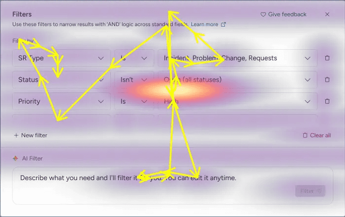 The challenge was designing a scalable, AI-driven filtering experience that reduces complexity and friction, supports PLG growth, and accelerates decision-making across teams.