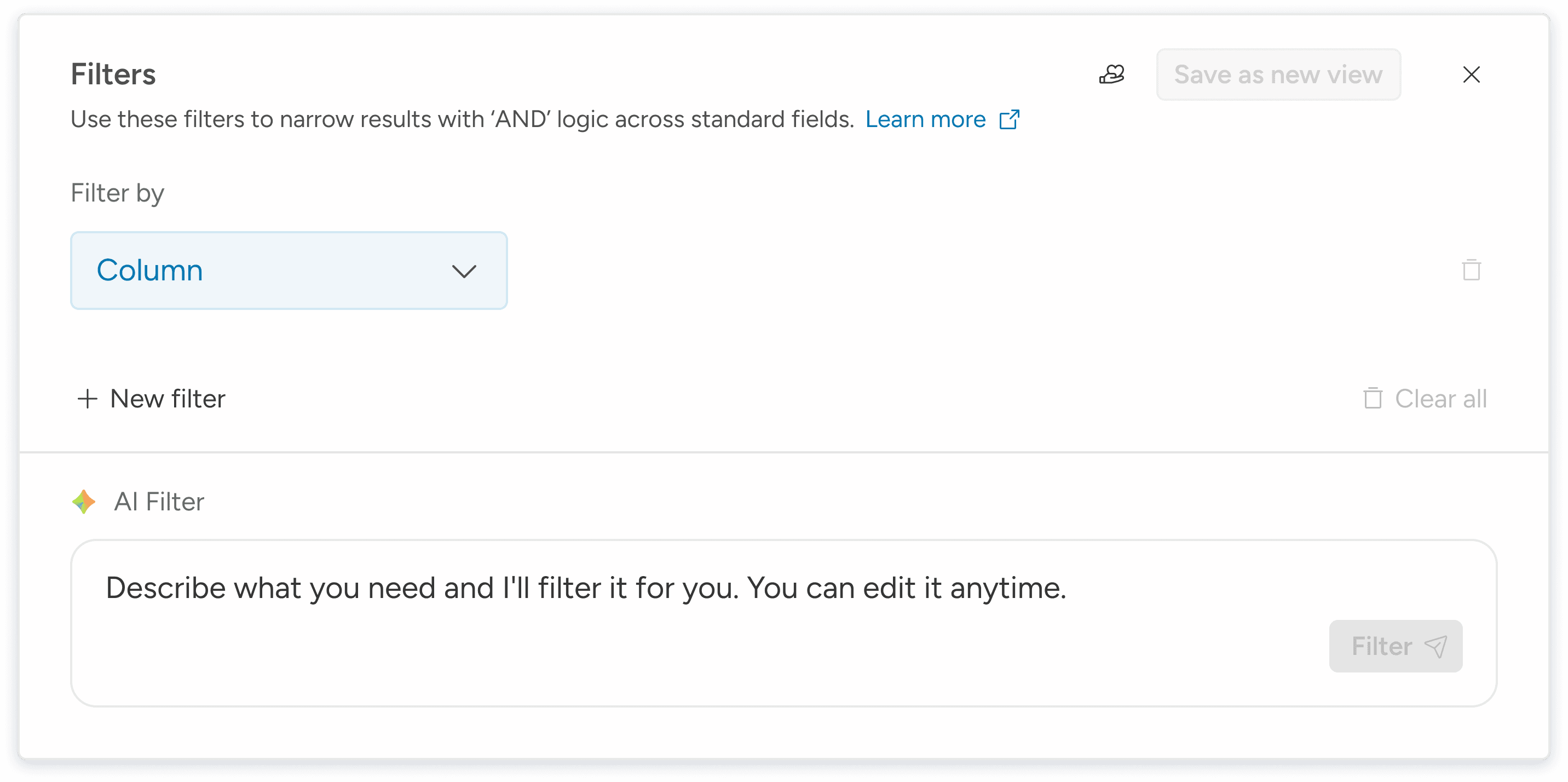 AI vs. Manual Ratio: % of total filter applications initiated via the AI prompt vs those initiated via the "Column" dropdown.