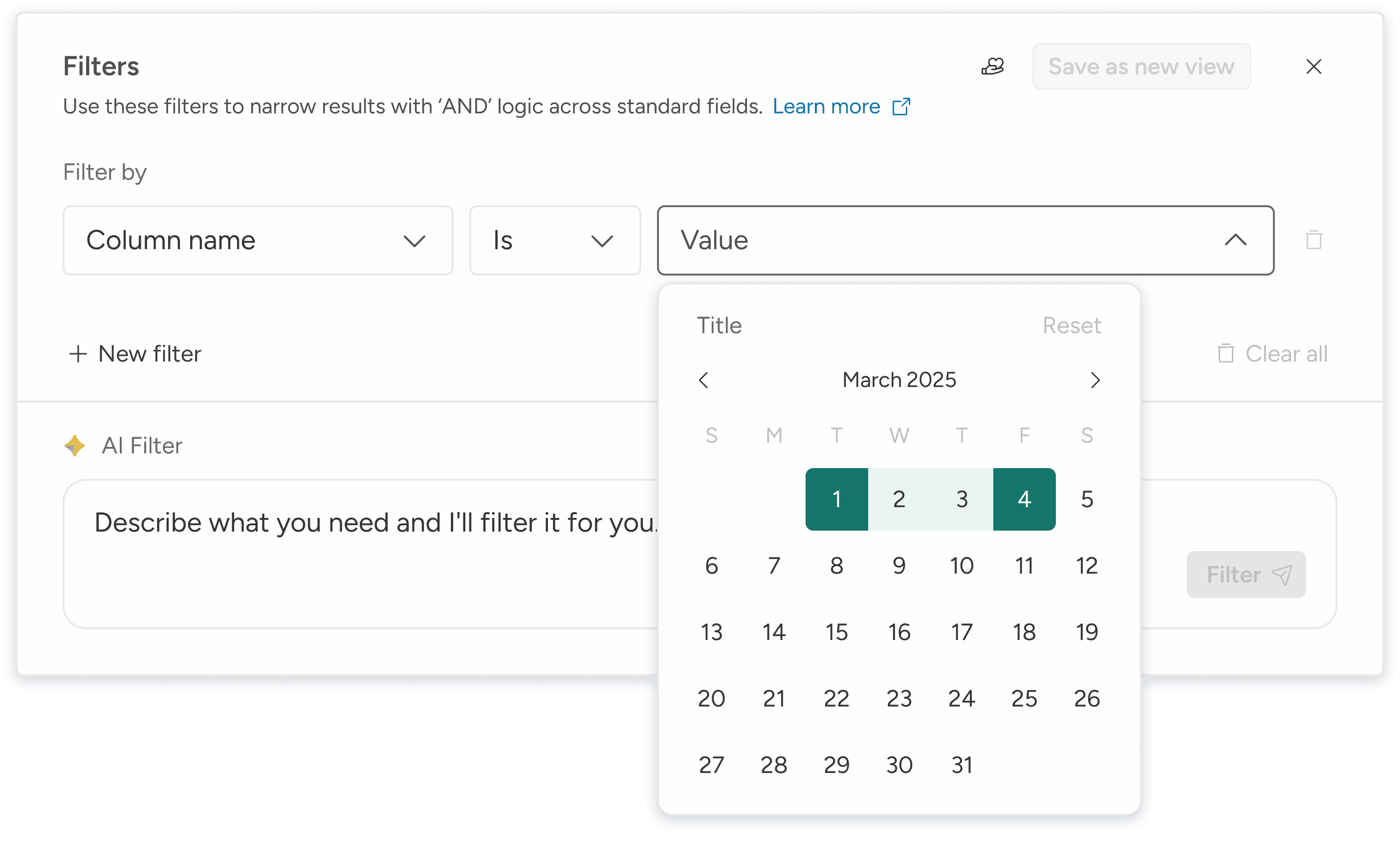 Intuitive defaults and dynamic values make filter building simple without sacrificing precision.