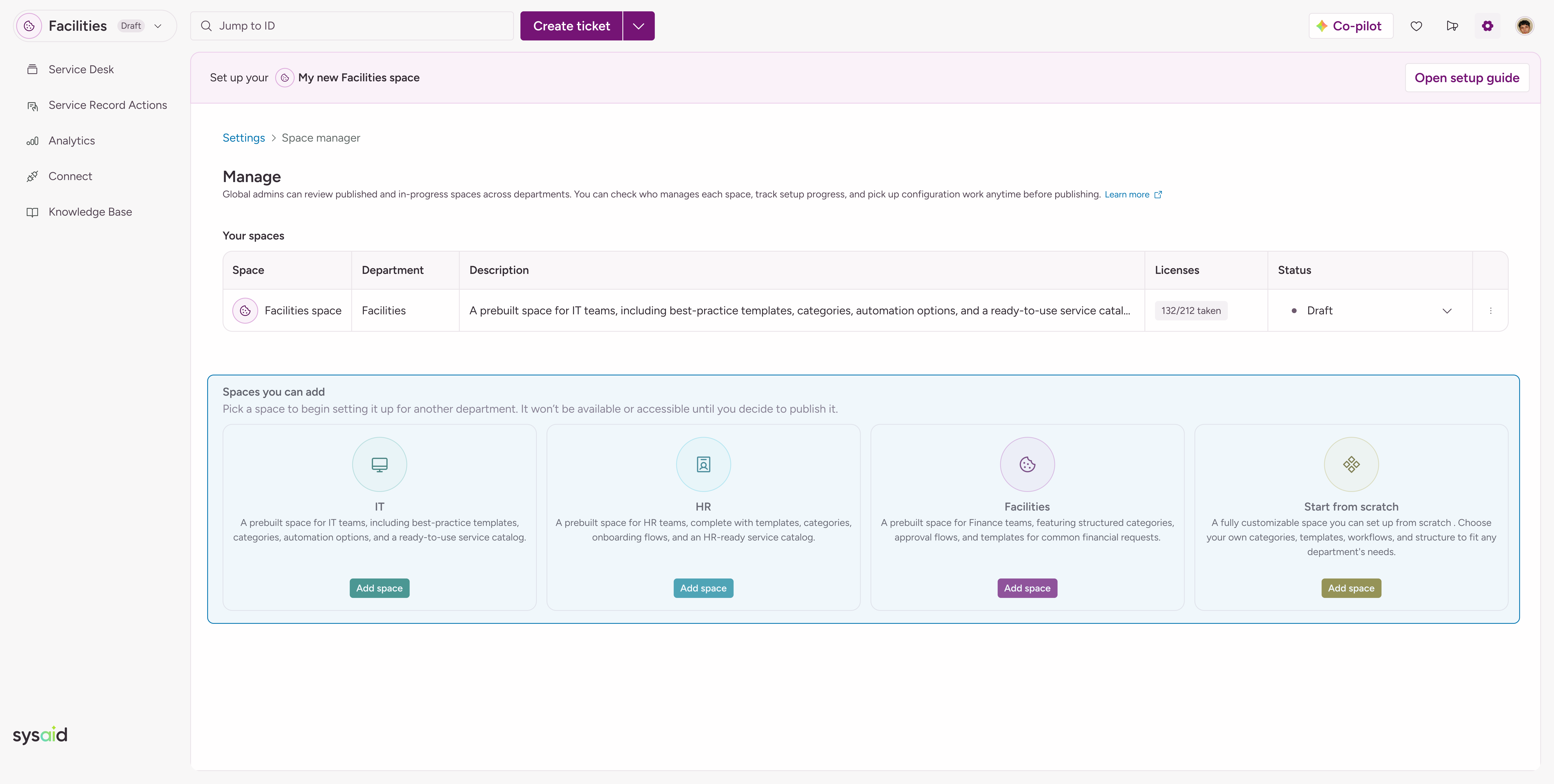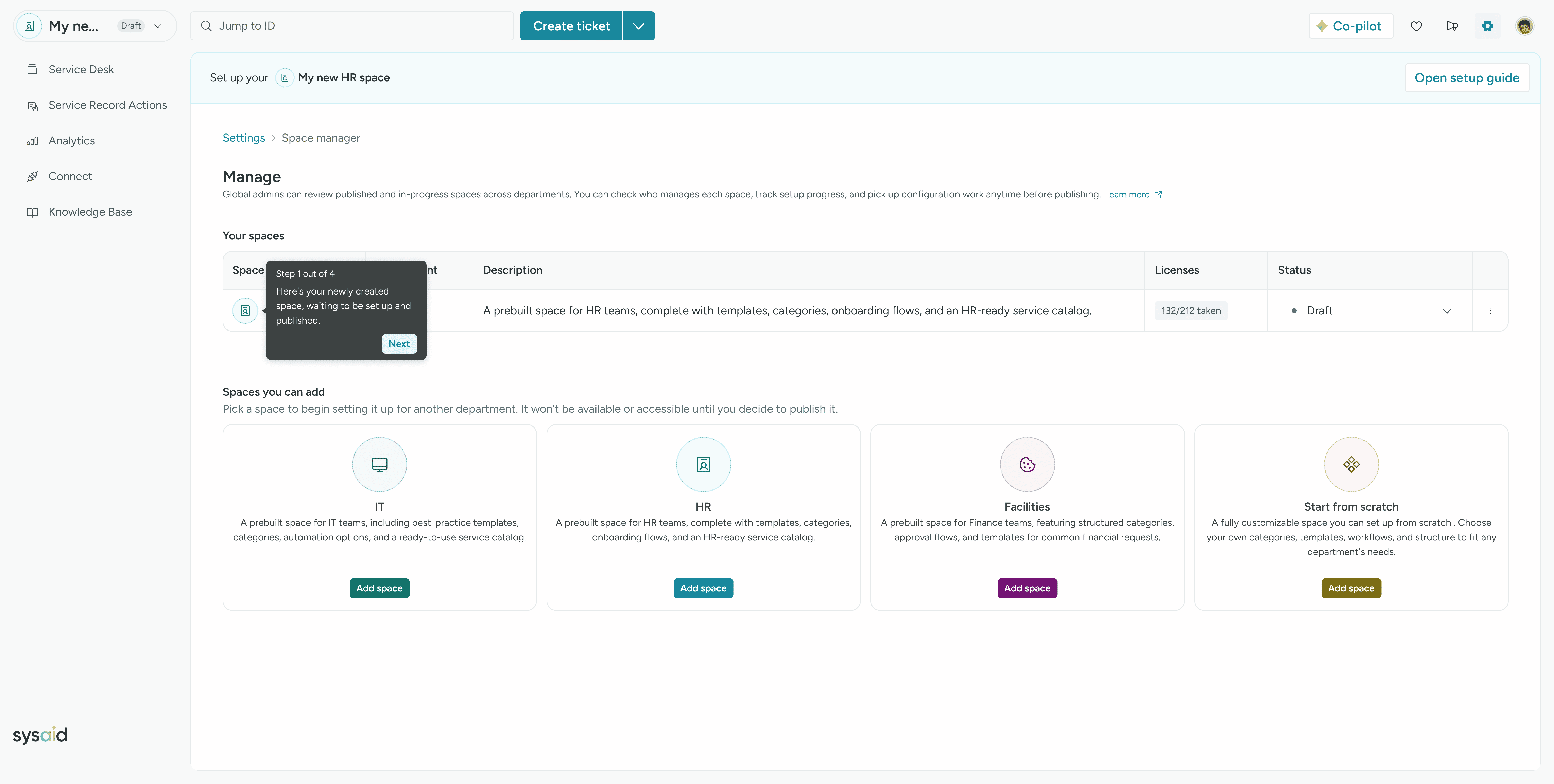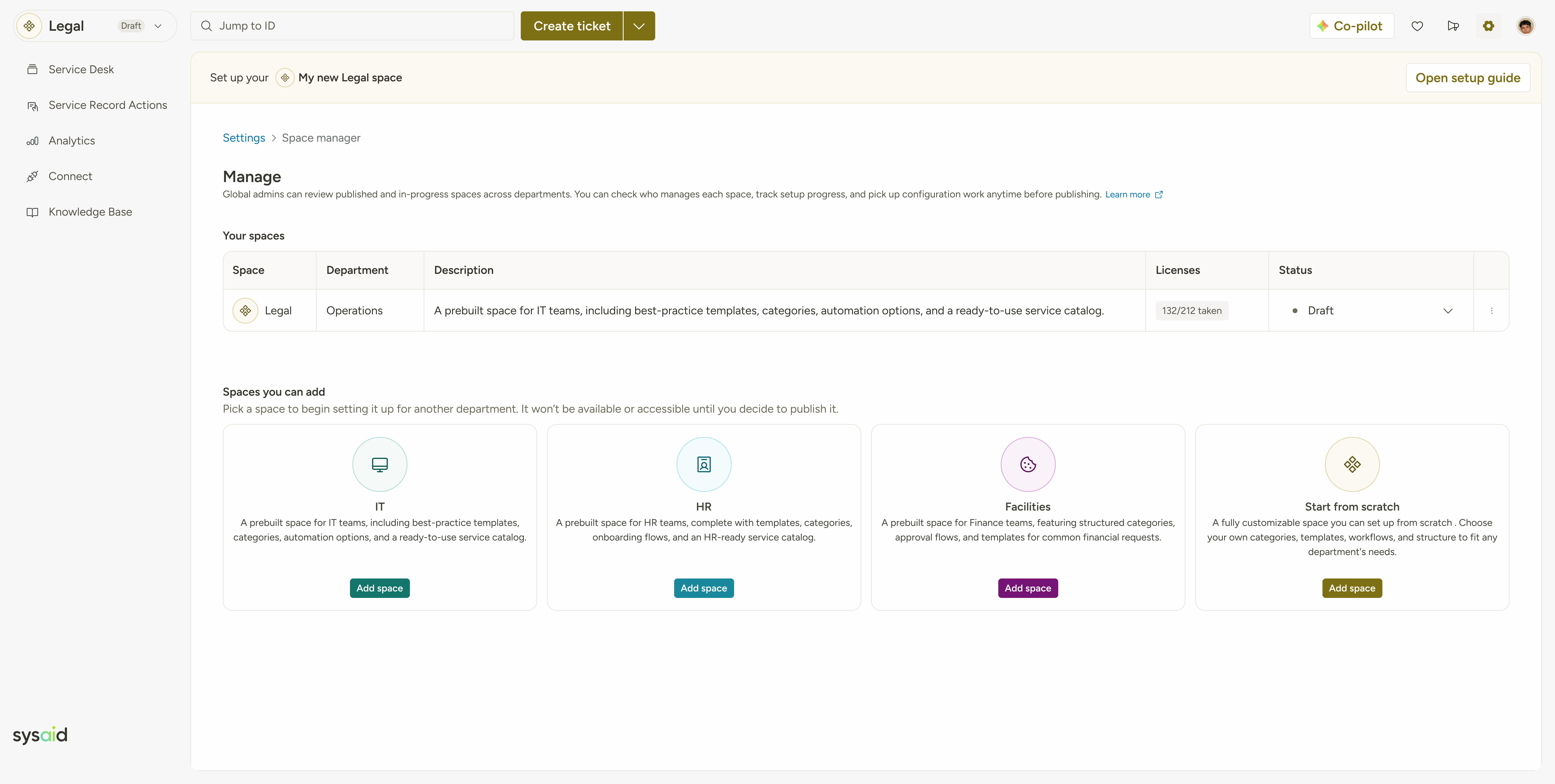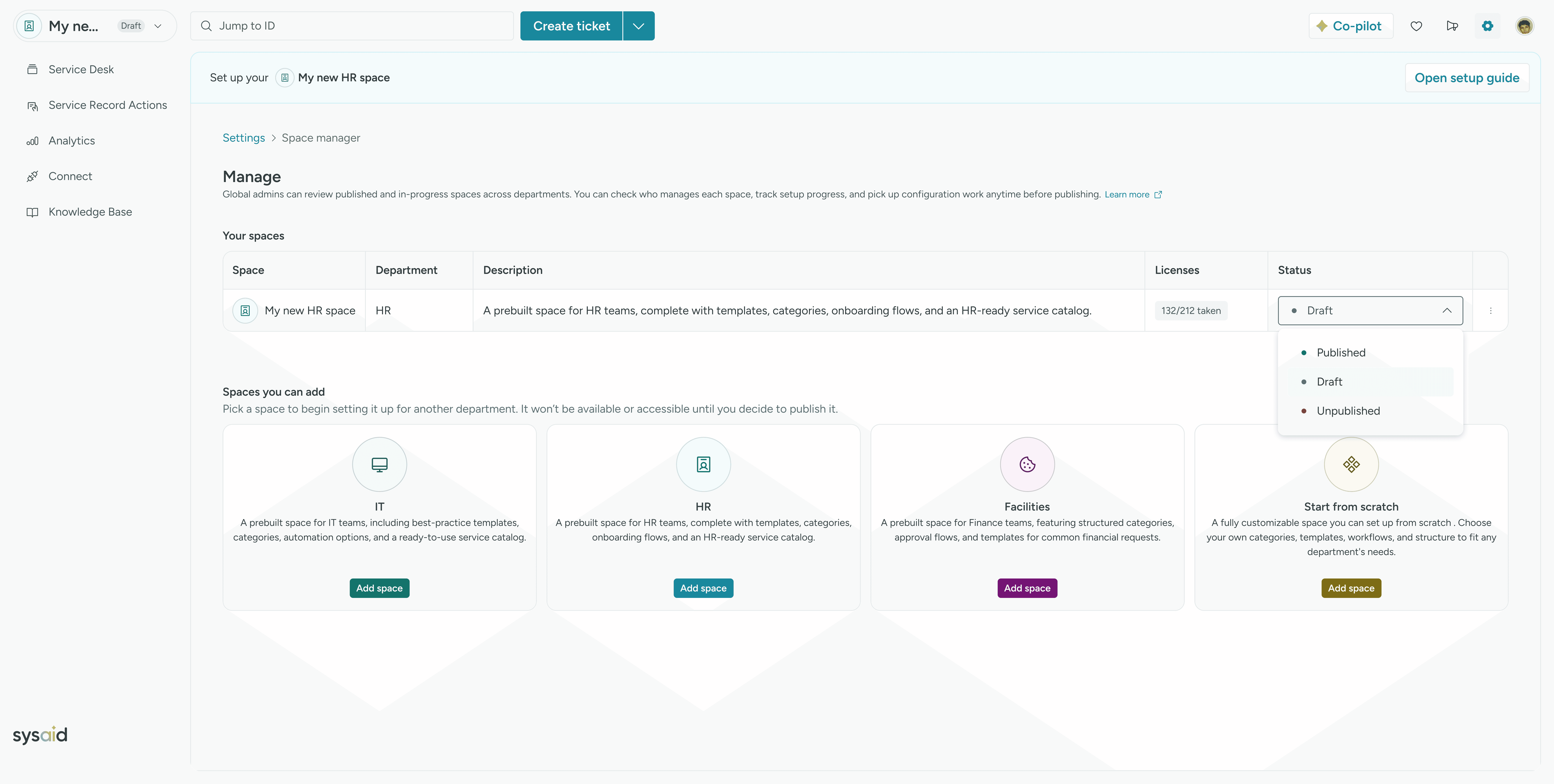 Self-serve Rate: % of new non-IT spaces complete setup (published) without SysAid assistance.