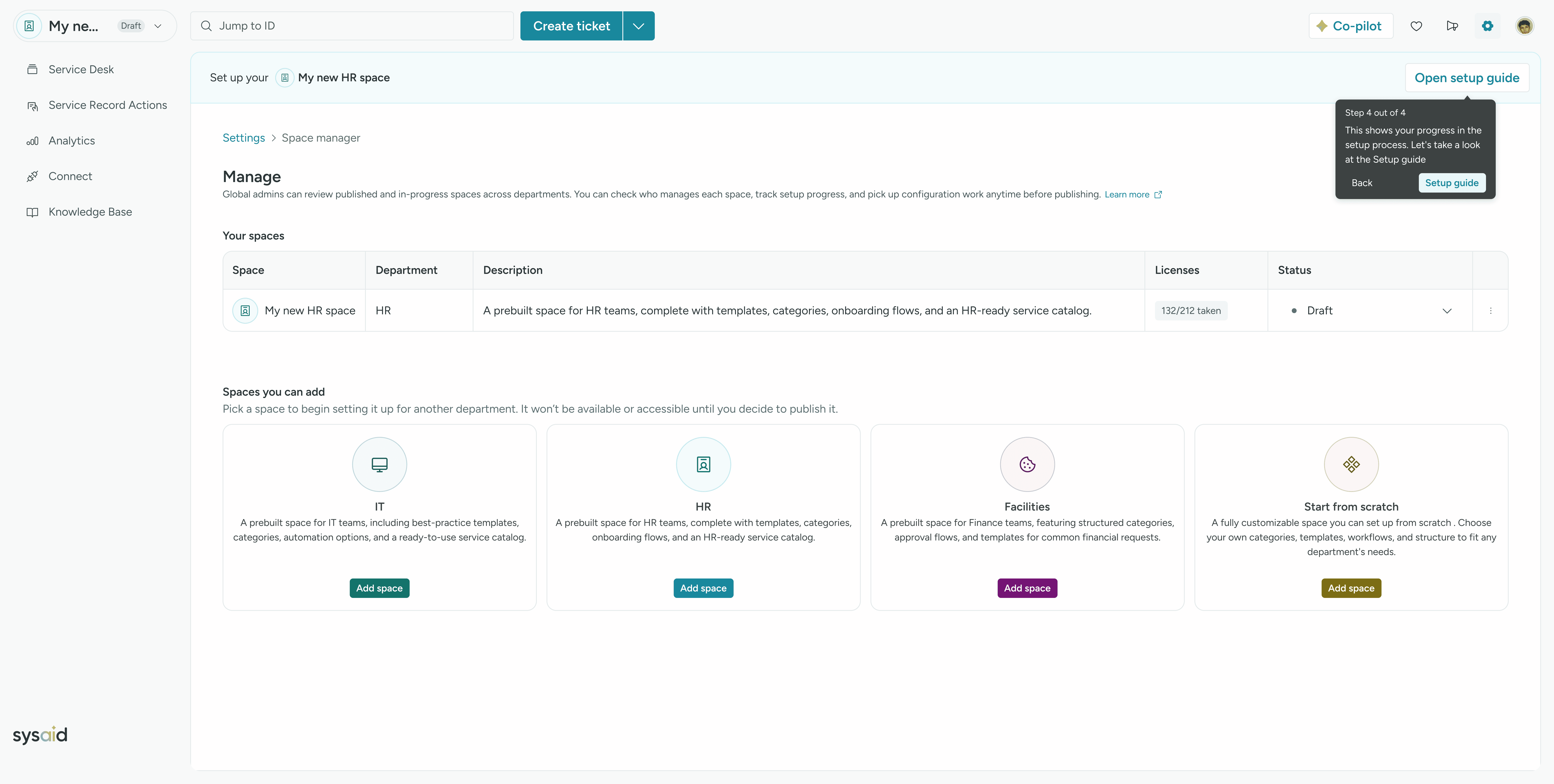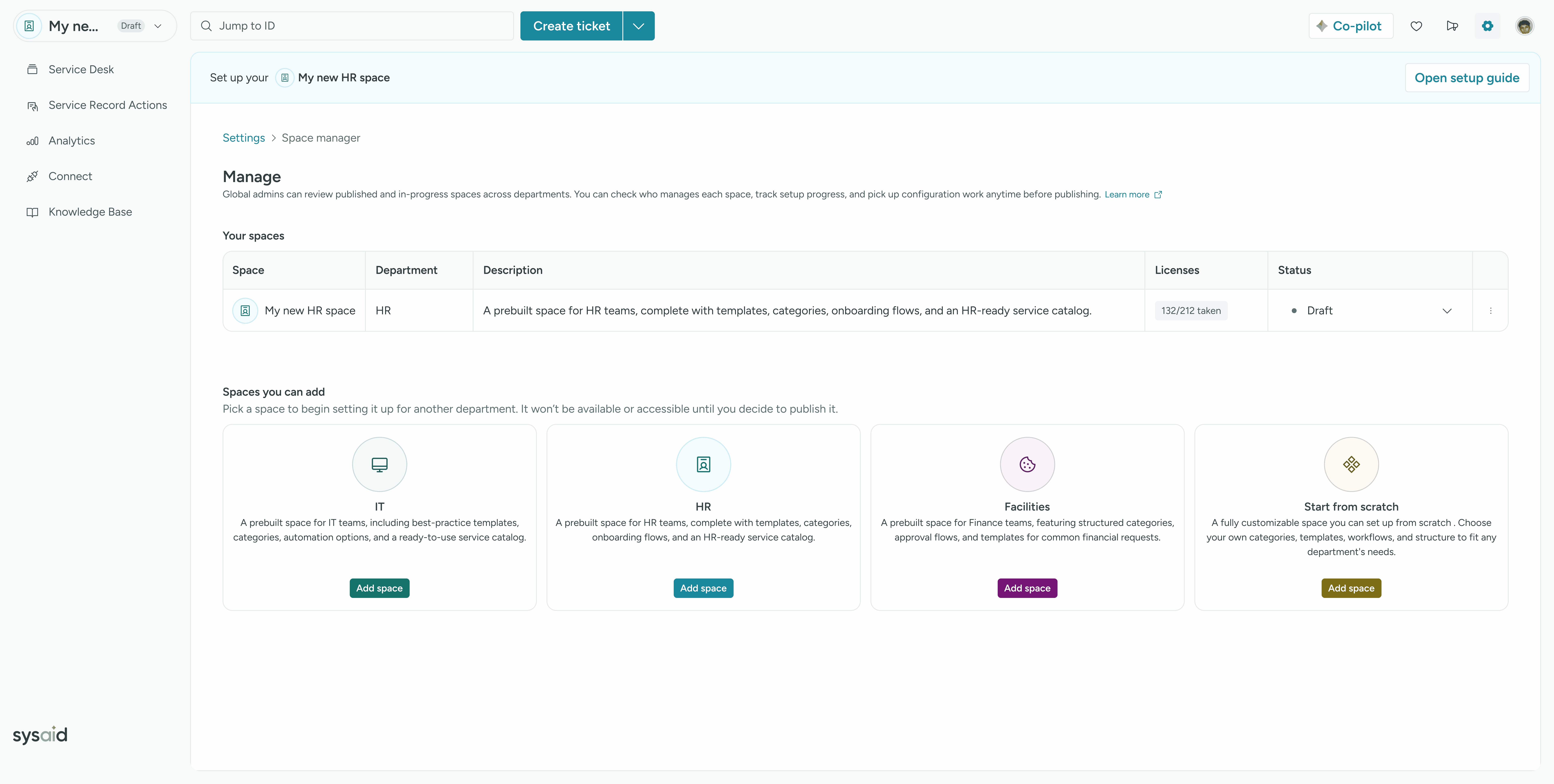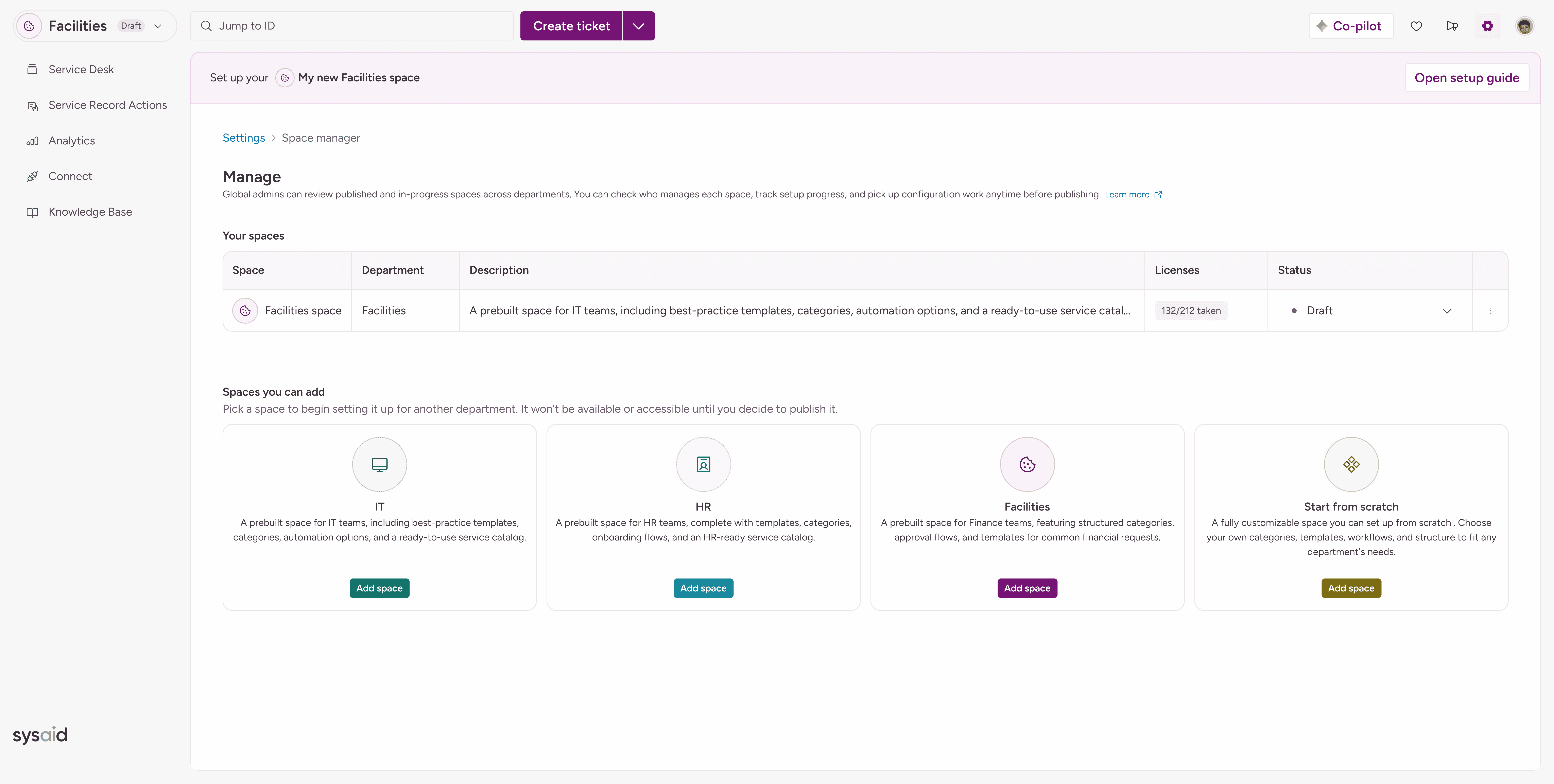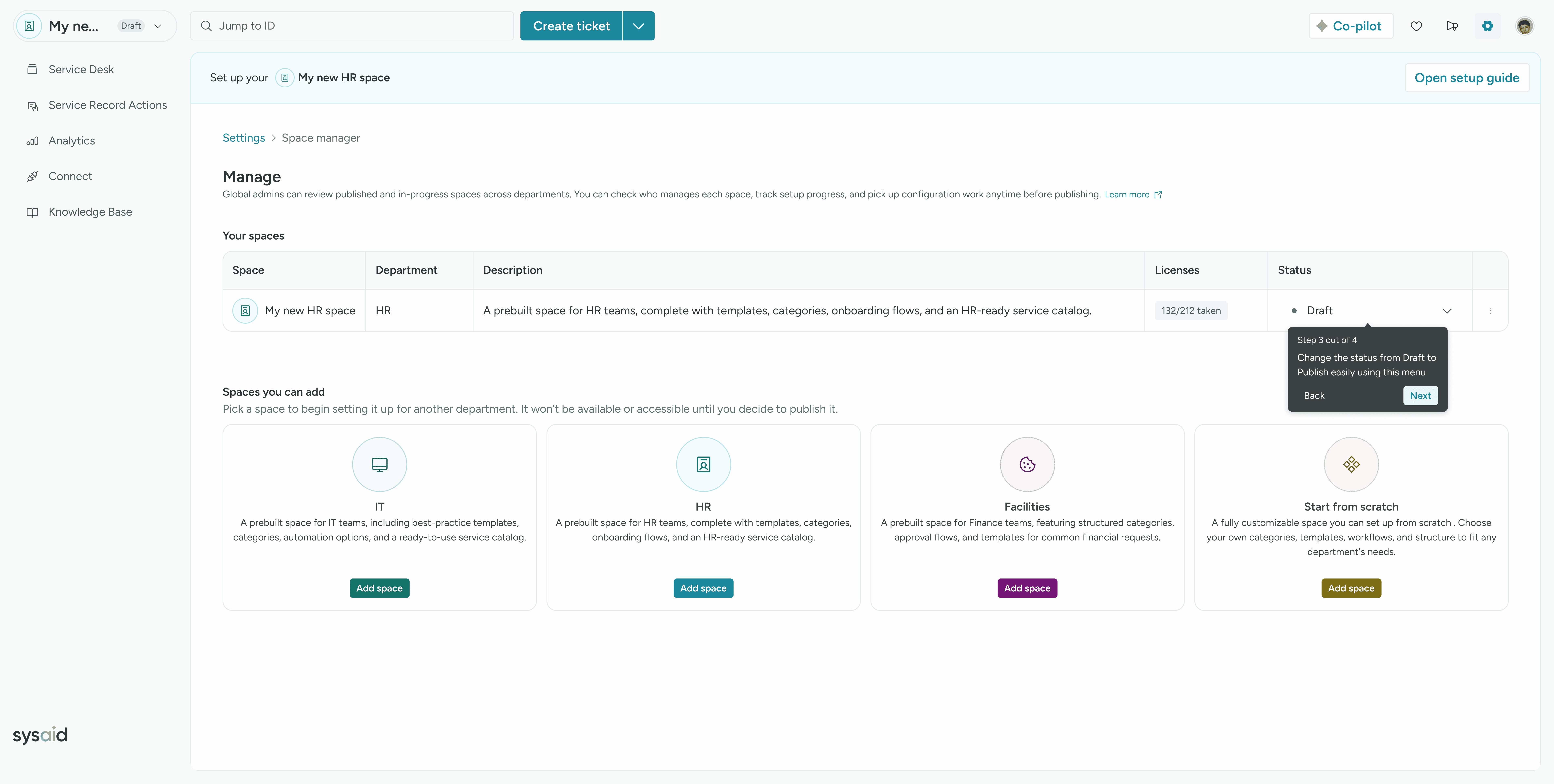 Self-serve Rate: % of new non-IT spaces complete setup (published) without SysAid assistance.