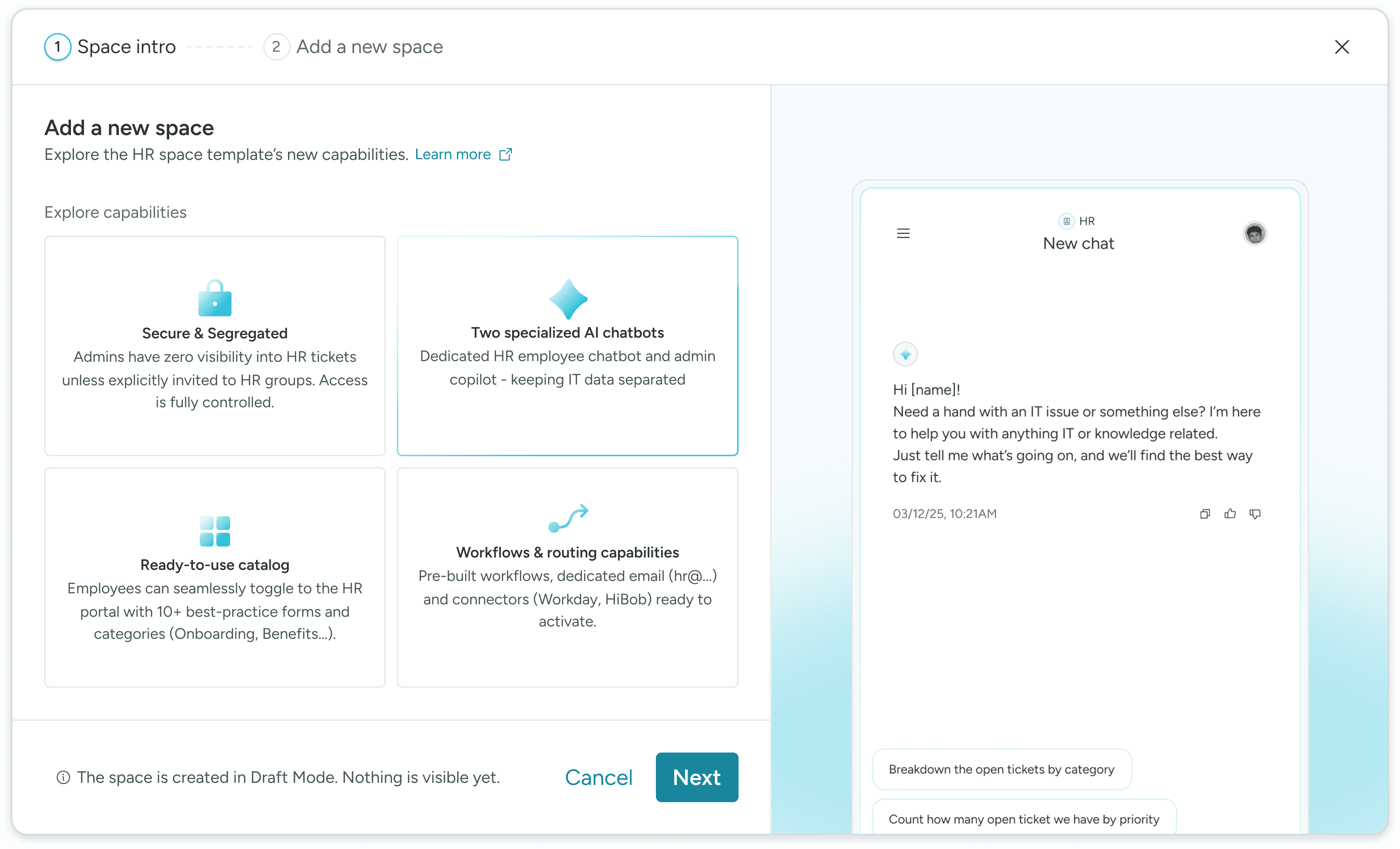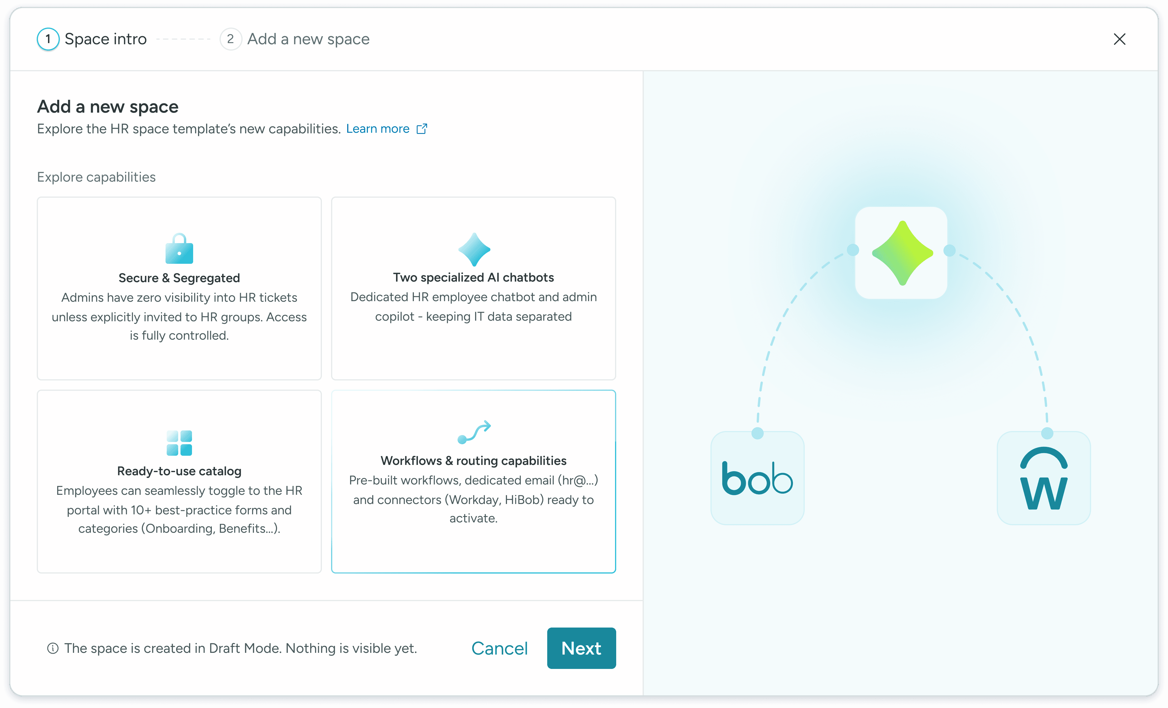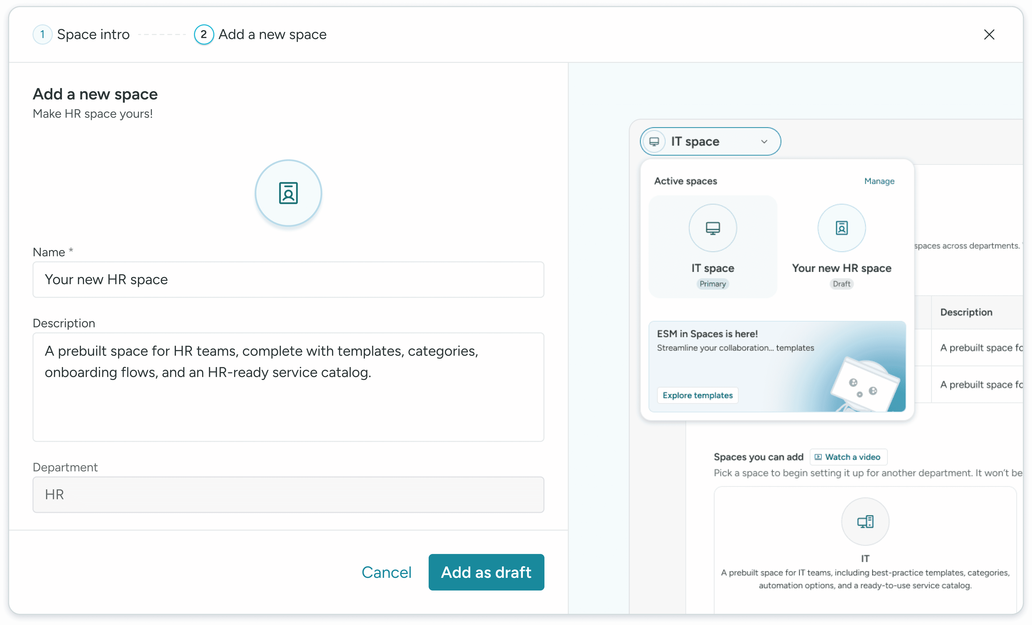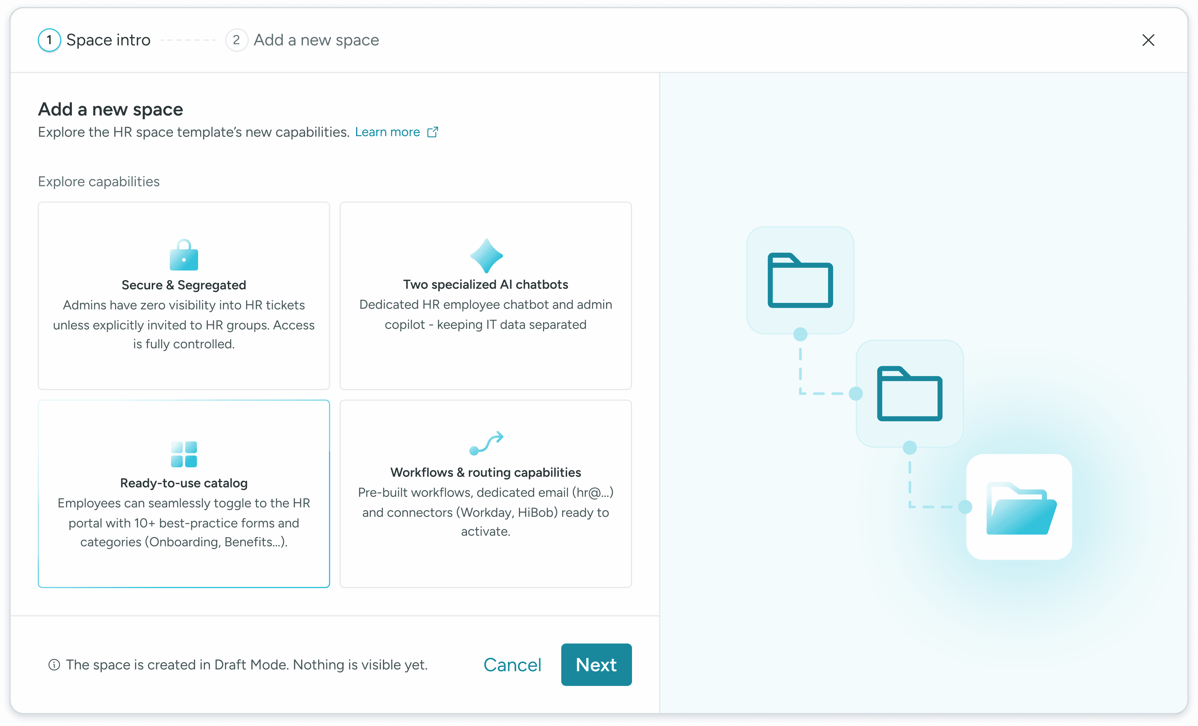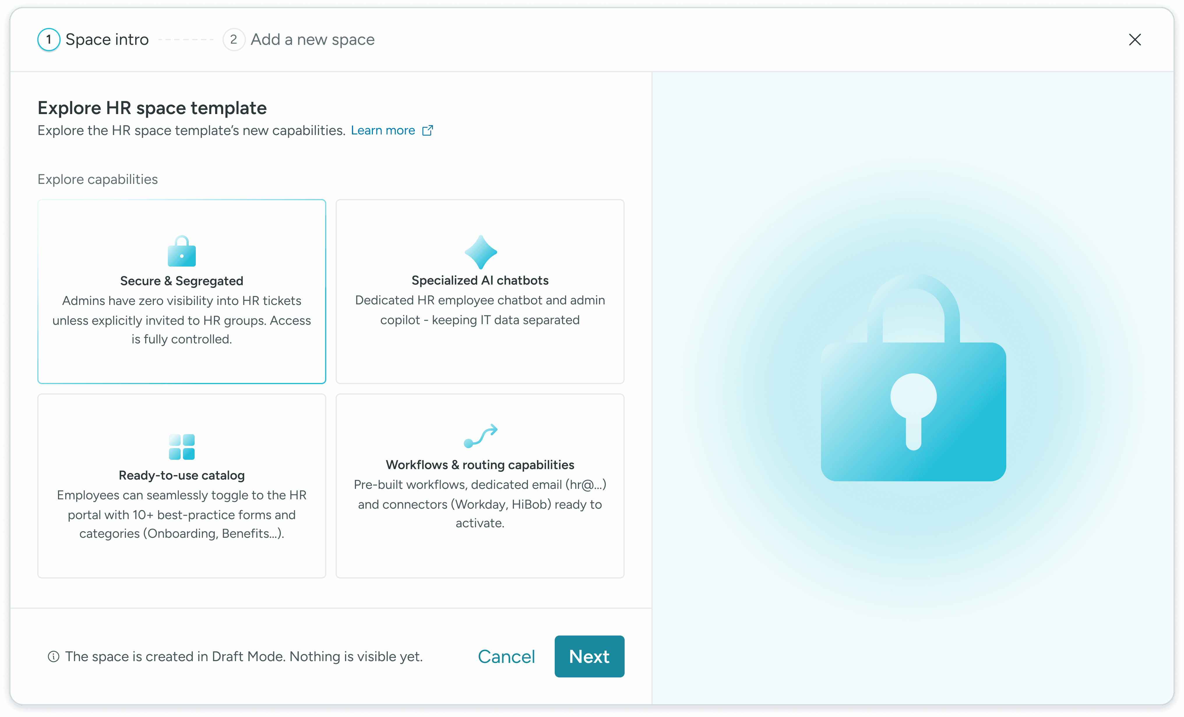 Visual preview showcasing new space capabilities before creating it - for clarity and trust.